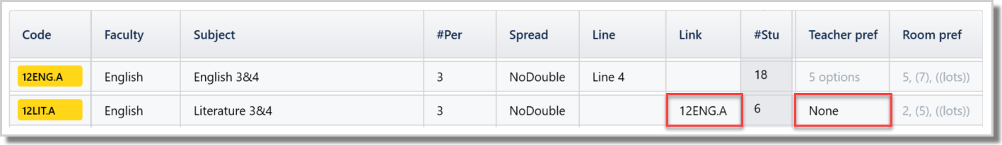 To allow a support or second teacher to be 'attached' to the main class, simply specify a class code in Link column and set RoomPref to ‘None’. The second teacher's class code will 'inherit' the room of the main class and this room will show on their timetable. The second class will not have any students. This second class is sharing the room with the main class that has been assigned the room. This is sharing, not a room clash.