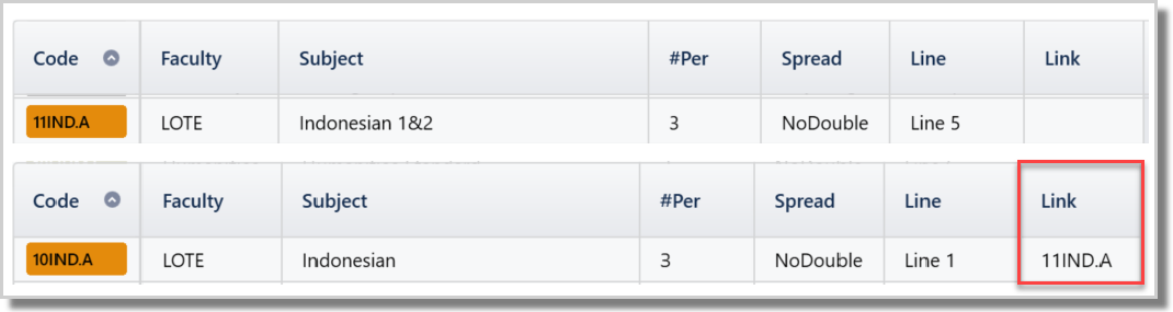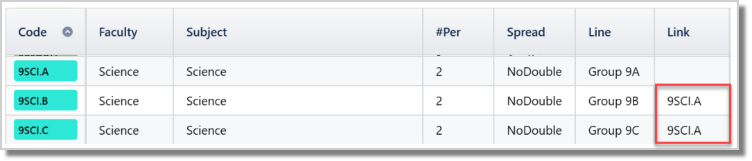 - e.g. Split students into 2 bands for Science. 9SCIA+B+C in the first band and 9SCID+E+F in the second band. In this case, link both 9SCIB and 9SCIC by putting 9SCIA in the Link column.