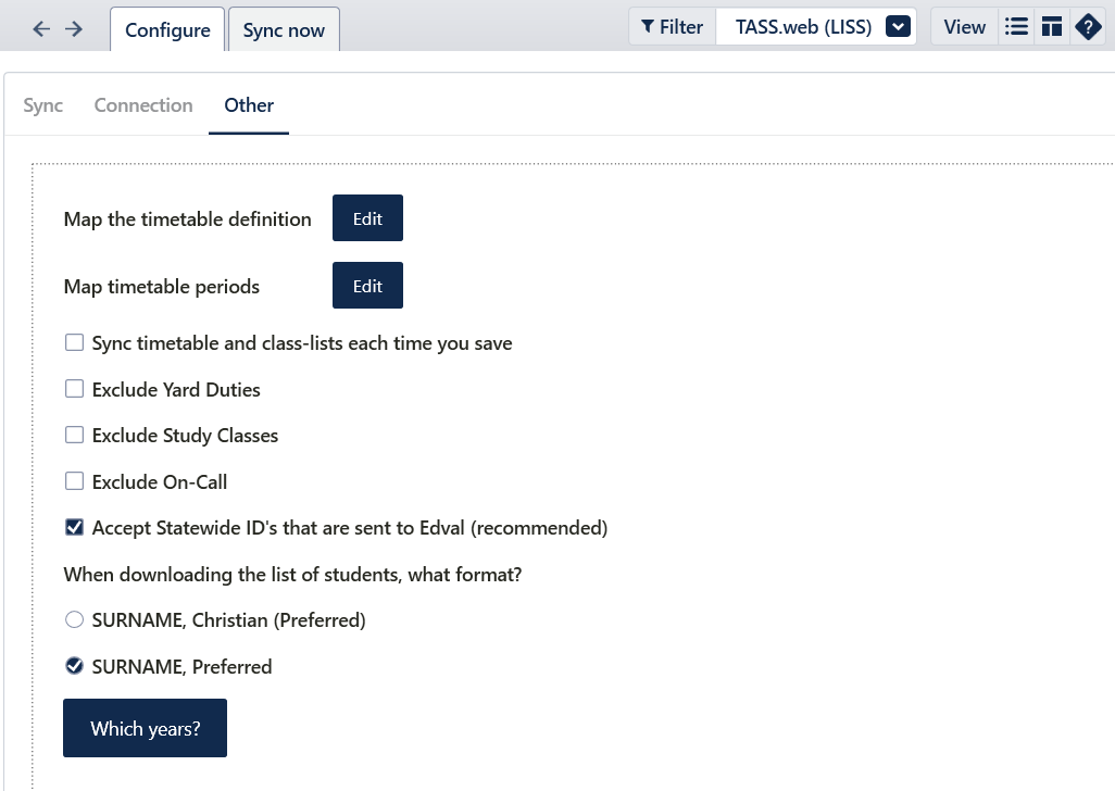 For example, sometimes users might like to perform parts of the sync, such as downloading teachers and rooms at the start of the year, or to publish the classes and class lists only to TASS.web.