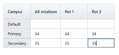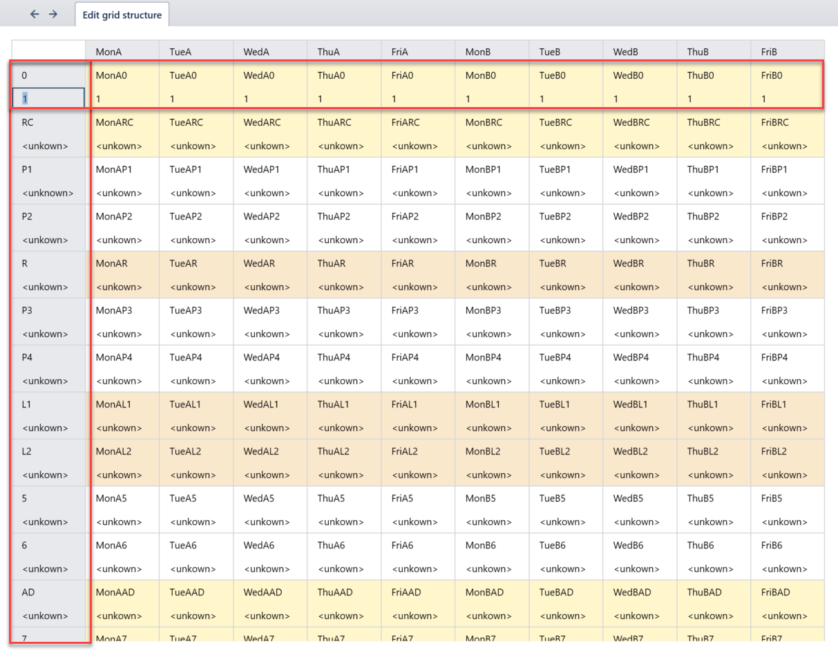 Grid structure codes | Yes | TASS converts period codes in the timetable file to numbers. The first period appearing in the grid structure will convert to 1 (no matter what the timetable file period code is), the second period in the timetable file will convert to 2, etc. TASS limits the number of periods to 30 per day and 25 days per cycle. | |