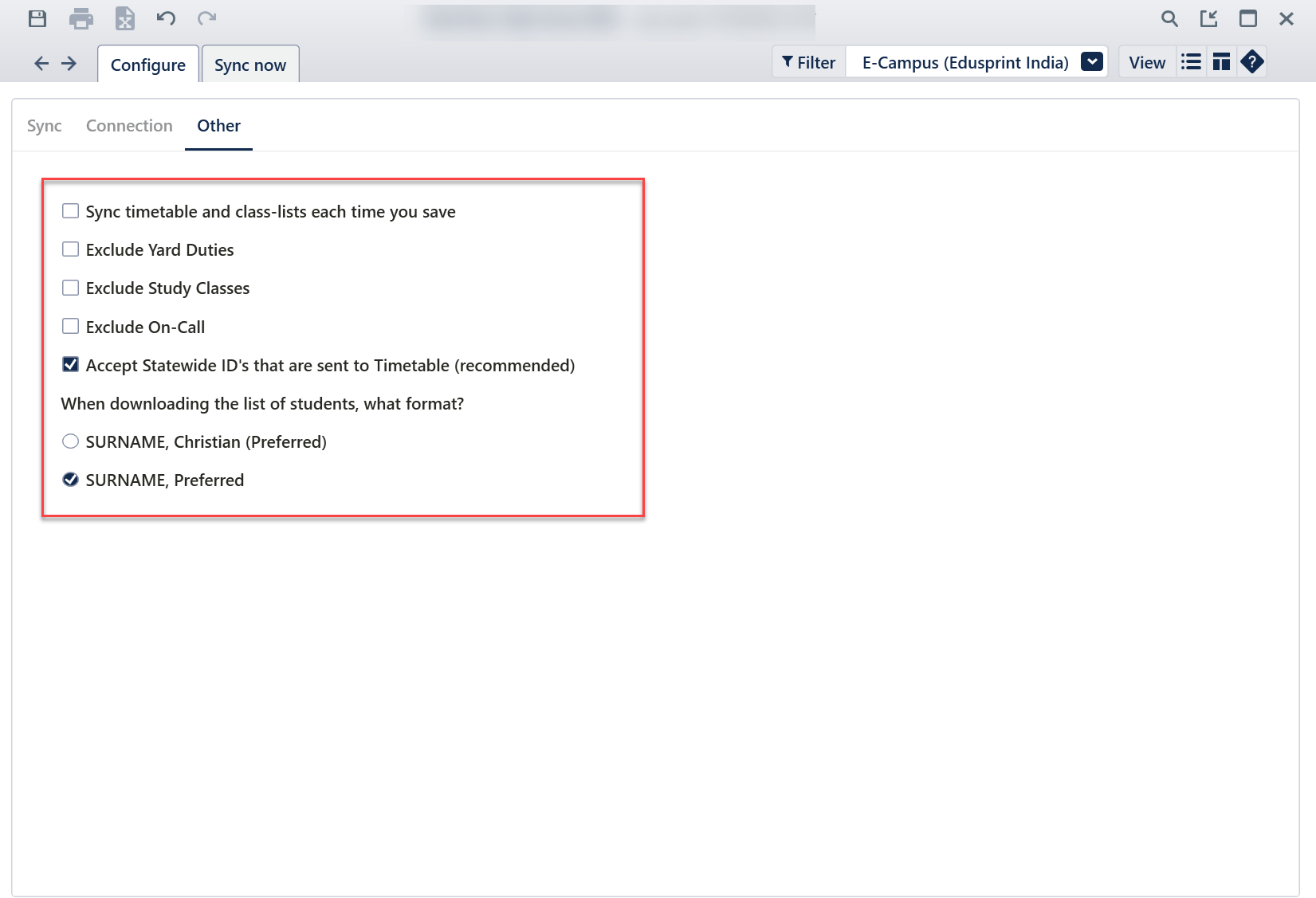 | Exclude Study classes | When ticked Study classes will be ignored for syncing purposes |