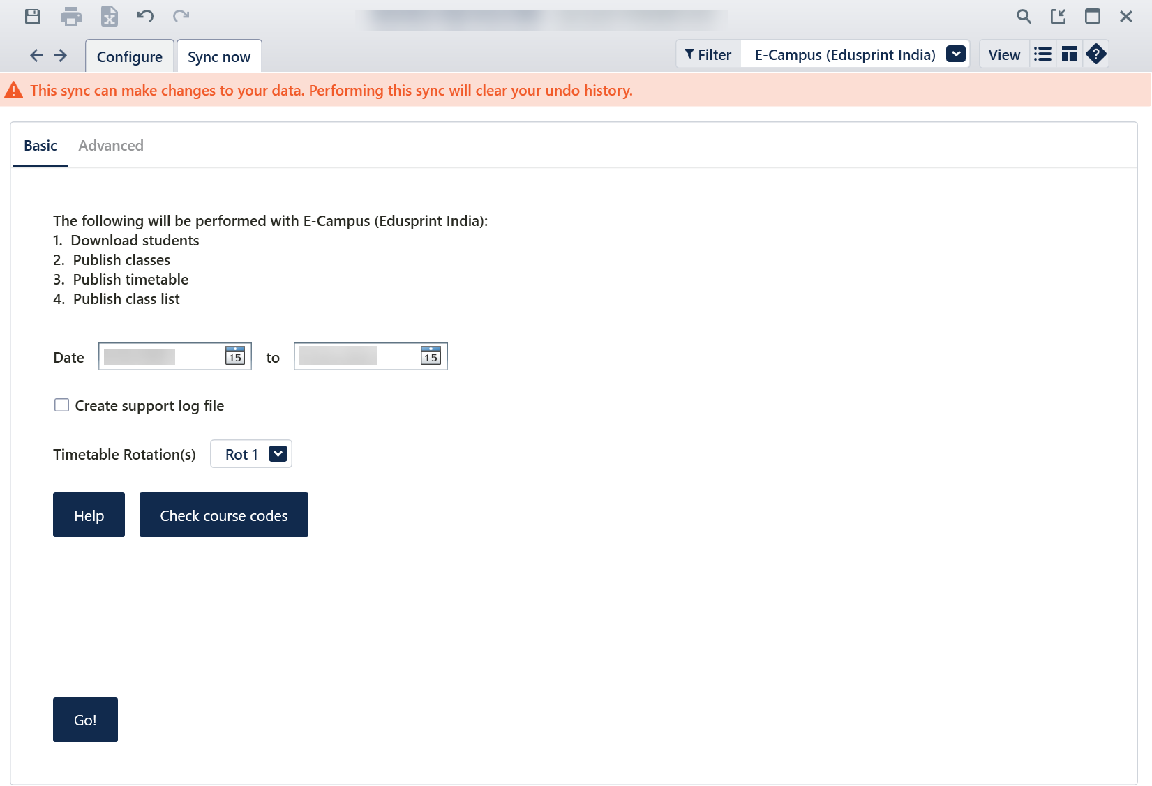 Check course codes: This button checks that classes with the same course codes but different subject names are flagged as E-Campus does not differentiate between them and applies the first subject name it sees for all classes with that course code. E.g. 12ENG1 - English and 12ENGA - Engineering. Course code for both classes is '12ENG' and E-Campus could label both as either 'English' or 'Engineering'.Advance Sync