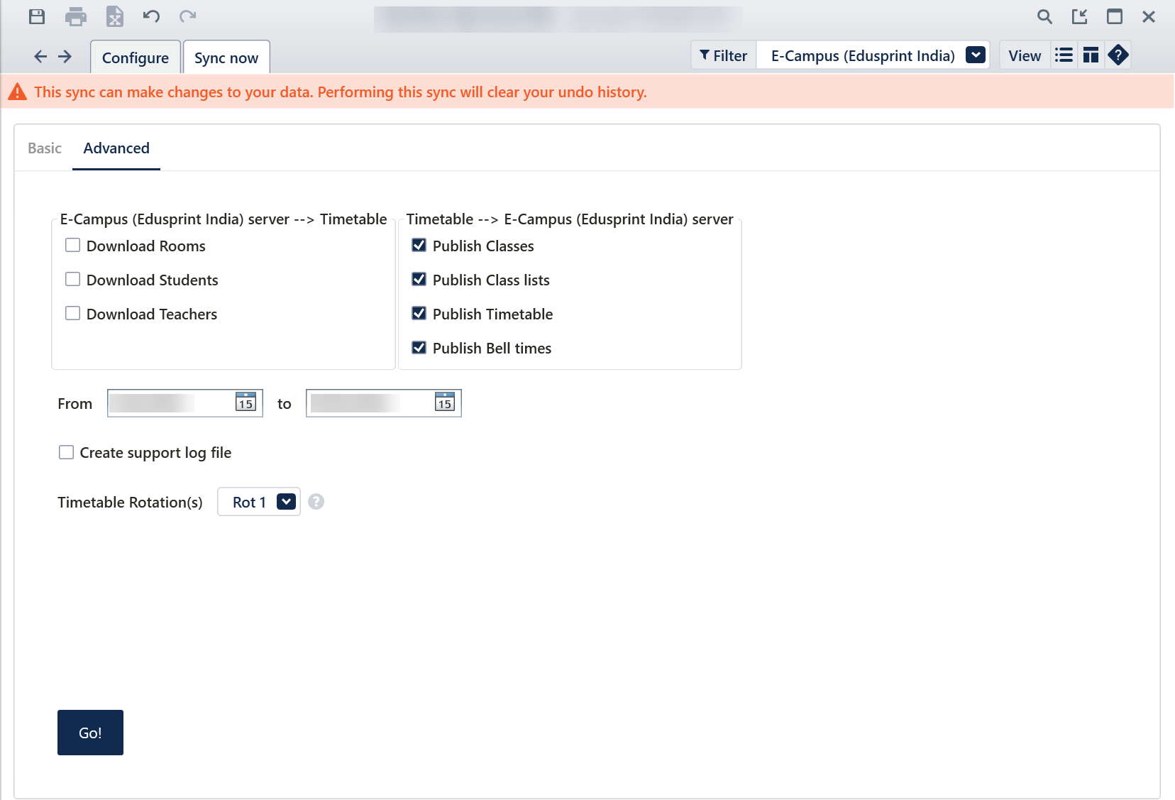 Advance sync is used to publish specific parts of your data to E-Campus. An advance sync also allows you to download from E-Campus as per screenshot below.