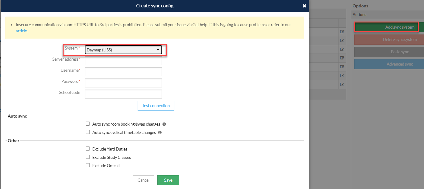 - Choose 'Add sync system' and select Daymap from the system dropdown.