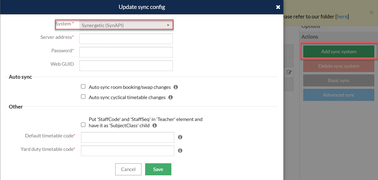 - Choose 'Add sync system' and select Synergetic from the system dropdown.