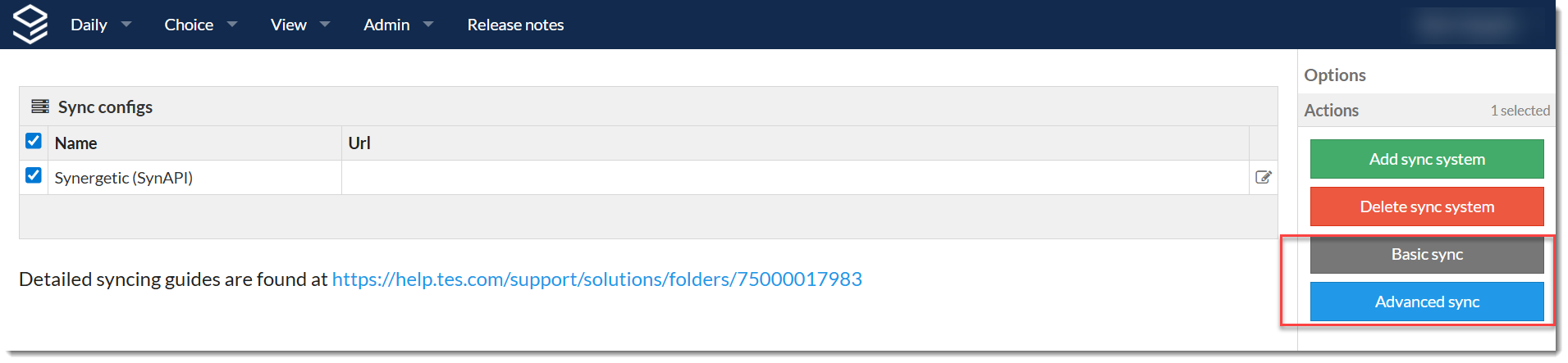 - Go to Daily > Synchronise and select the Synergetic configuration
