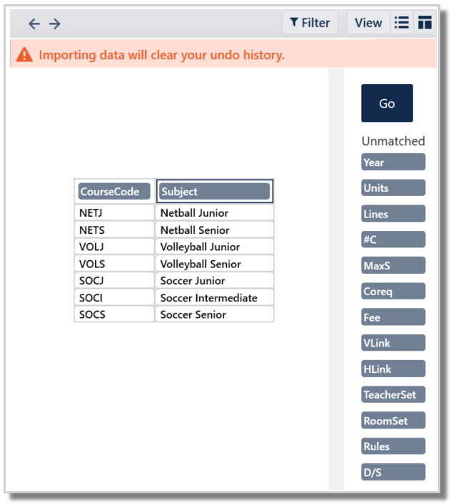 Create a spreadsheet with 2 column headings 'CourseCode' and 'SubjectName' for and enter each sport activity on offer underneath. Save this file to import in later steps.