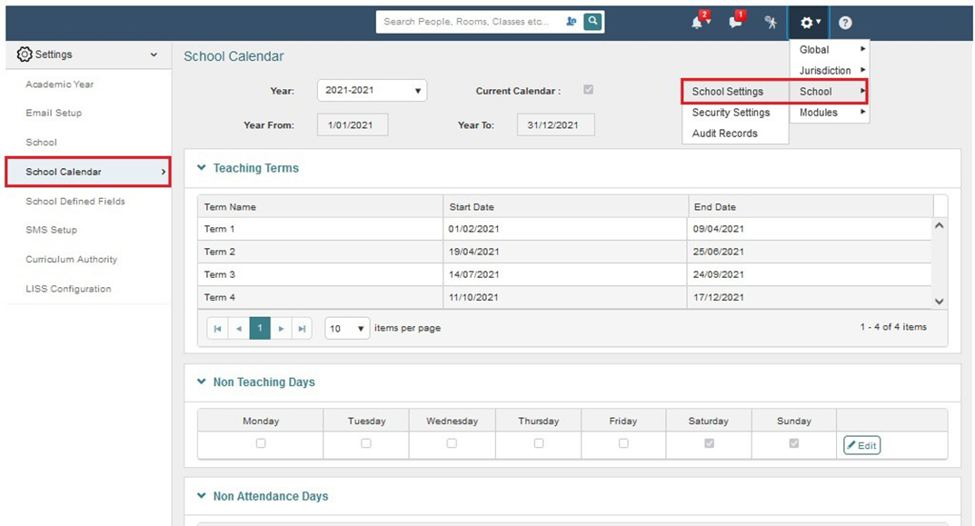 - School Calendar: Teaching Terms, Non Teaching Days, Non Attendance days