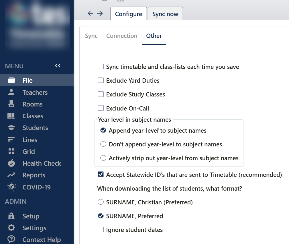 | Accept StatewideID's that are sent to Tes (Recommended) | Generally, Tes will obtain statewide ID's from the external school information/admin system (SIS), as this is regarded as source of truth for this field. However, some users want this field for different purposes. In NSW for example, some prefer to have the student code field for the 'ERN' number, but the Statewide ID field for the NSW Board of Studies registration number. If so, you may want to untick this, and retain your BOS number in the Statewide ID field. |