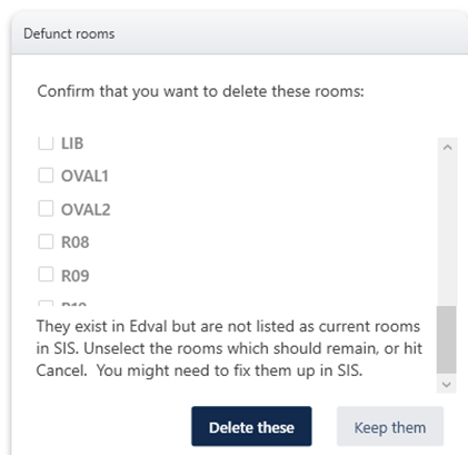 The screen displayed here shows the list of rooms that exists in Timetable file, but does not in other system. You have the option to delete these rooms from Timetable file, or keep them.