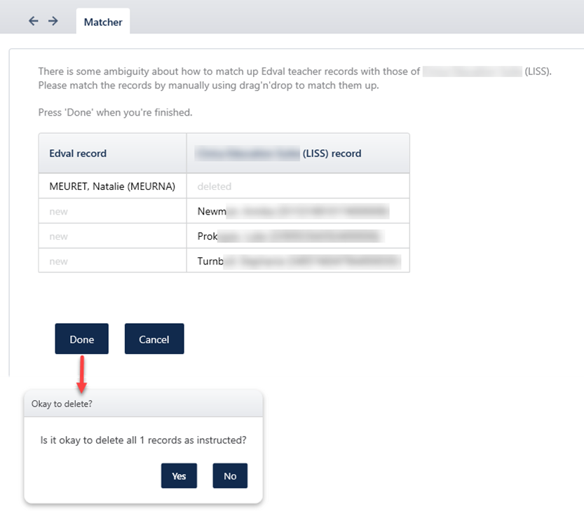 If there is any unmatched data left and you click on 'Done', a message will pop up asking if you wish to delete the entry or leave it as it is. This means it will download the new teachers and leave the existing unmatched teachers in the Timetable file as is.