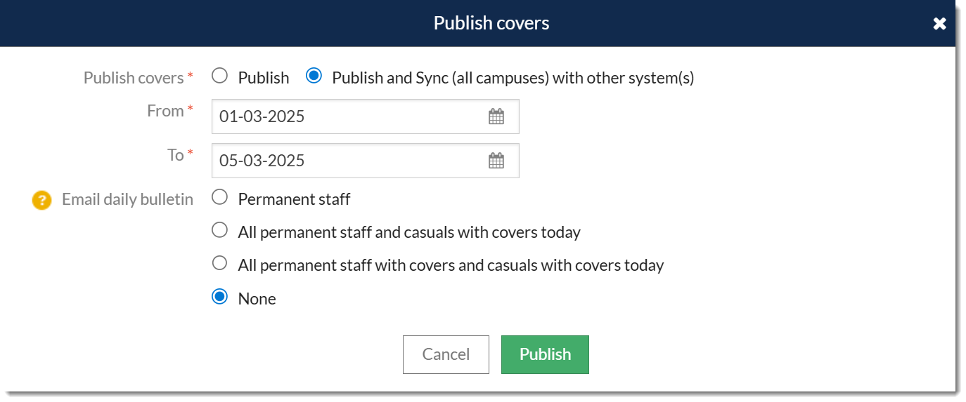 Sentral does not allow the syncing of daily variations for date ranges exceeding 30 days.Publish & Sync