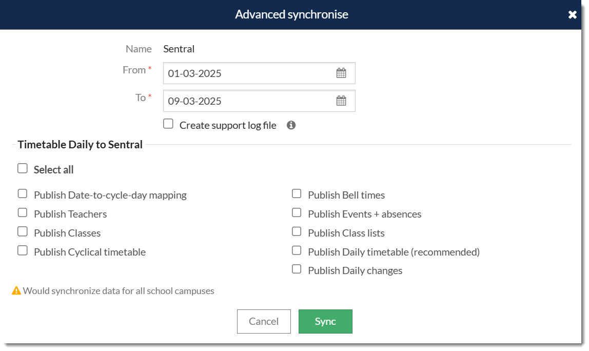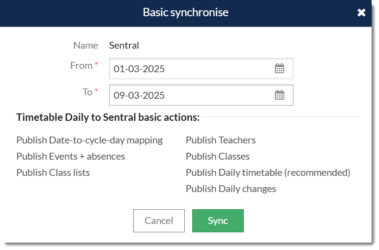 - Go to Daily > Synchronise and select the Sentral sync configuration.