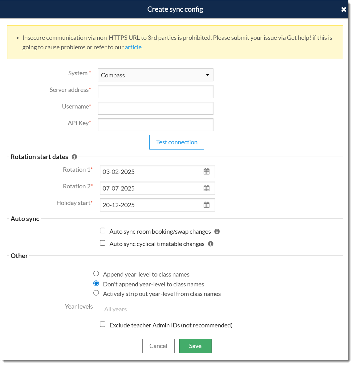 Set the rotation start dates here as per your term dates in Compass. This must also match your rotation start dates for Compass in your timetable sync configuration if you've done that as well. If your school runs a head start or early commencement program in term 4, click here for more information and refer to any guidance from Compass on the topic as well. - The 'Auto Sync' section is deselected by default. If you wish Timetable Daily to sync room bookings and/or cyclical timetable changes from the timetable file automatically then select one or both of these options. For more information on this feature please see the following document: Automated Instant Synchronisation.