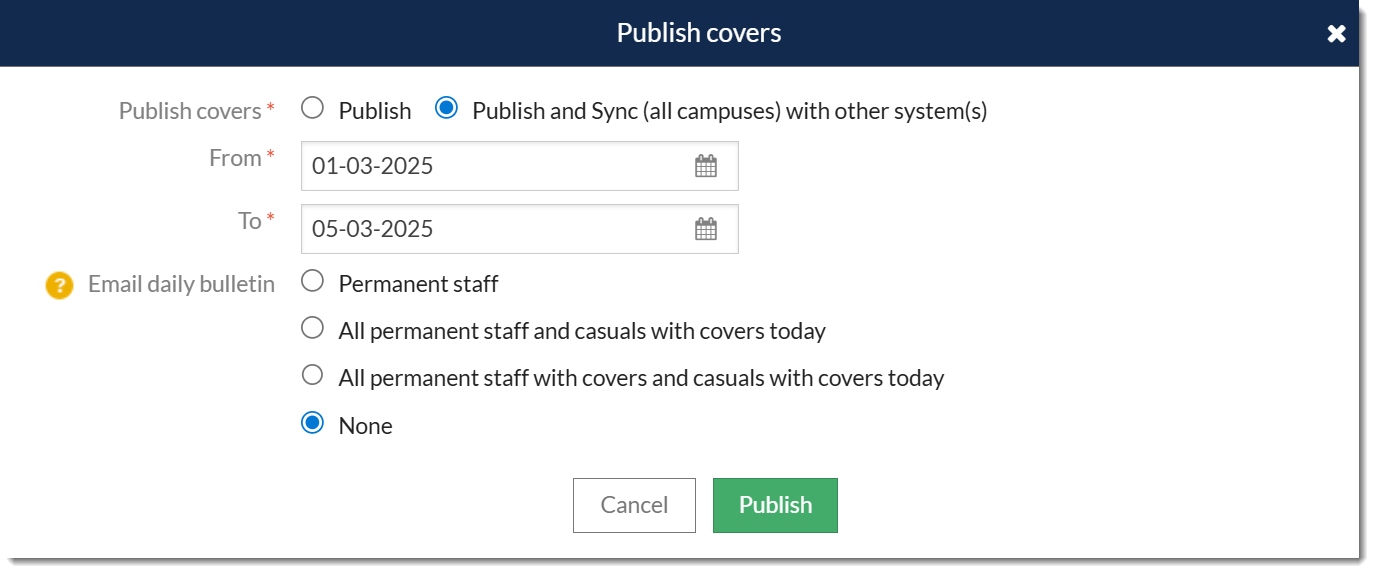This option is recommended for everyday syncing. This will sync all the daily variations included in the date range, for every system configured in Daily > Synchronise. For more information on publishing, please see the following document: Timetable Daily: Covers Tab