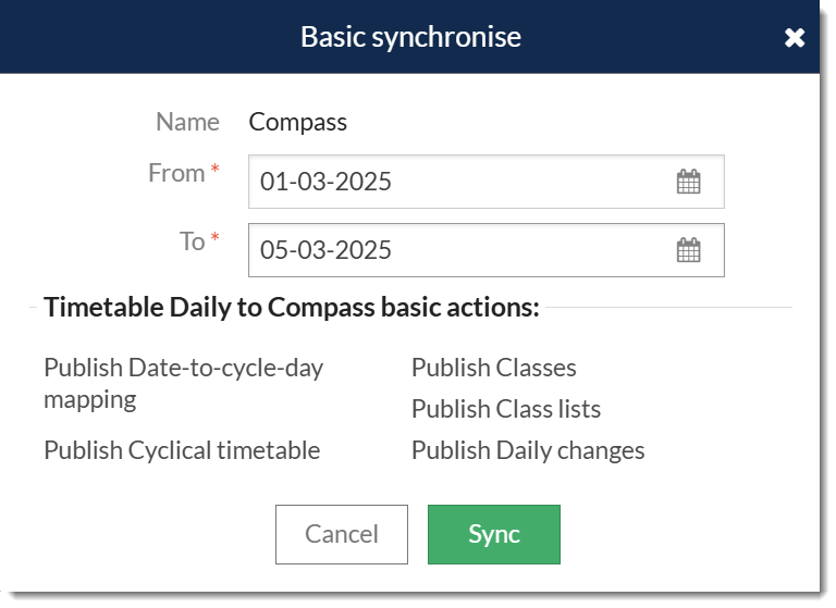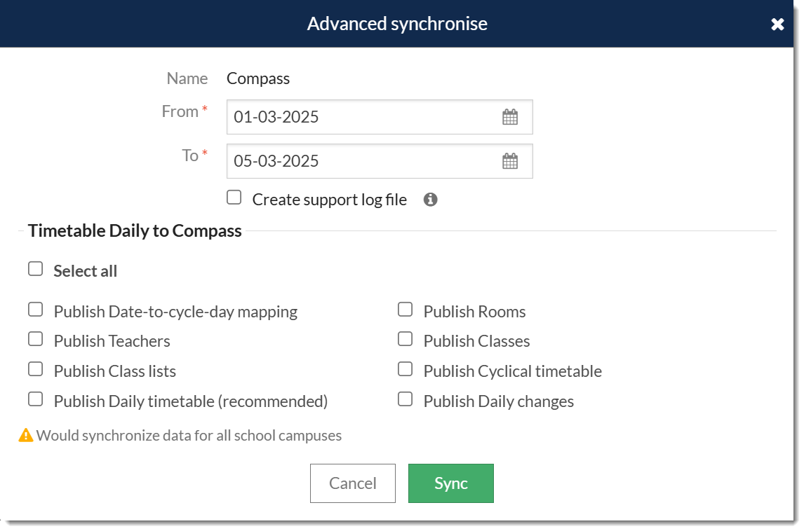 | Rotation classes | Classes from particular rotations | No | Compass will receive all exportable classes in the timetable, however the timetable data for those classes can be sent per rotation. The rotation for syncing will default to the current rotation set in the file under Settings > File, but you can override this when doing an advanced sync. |